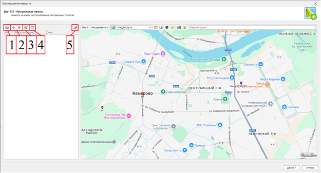 Для прокладывания маршрута, необходимо нажать два раза левой кнопкой мыши на карту для добавления контрольного пункта. Далее необходимо выбрать зону на установленной точке в окне прокладывание маршрута. После установки всех КП, нажмите Далее для прокладывания коридора.