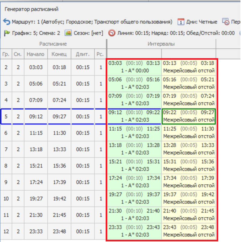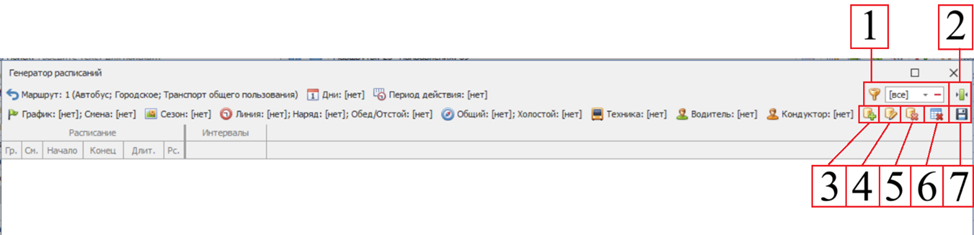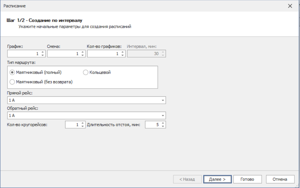 В открывшемся окне, укажите график, смену, количество графиков(необходимо для создания нескольких выходов, при указании более двух графиков, возможно указать интервал между выходами), выберите тип маршрута, выберите прямое и обратное направление, укажите количество кругорейсов и длительность отстоя после выполнения рейса.