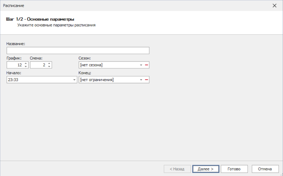 В открывшемся окне вы можете указать название. Изменить график, смену, сезон(список сезонов можно добавить, в справочнике сезонов), начало и указать конец для определенного расписания.