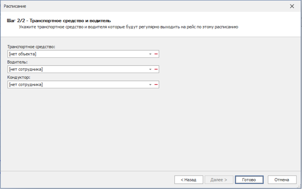 На следующем шаге можно закрепить транспортное средство, водителя, кондуктора. Данная информация будет отображаться автоматически при создании наряда во вкладке «Диспетчер».