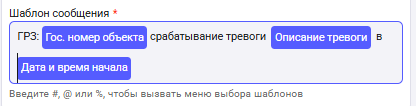 Шаблон сообщения - поле, позволяющее сформировать шаблон сообщения для отправки уведомления о тревоге. Для вызова меню выбора шаблонов введите в поле #, @ или %, а также вводите дополнительный текст для формирования содержания сообщения.