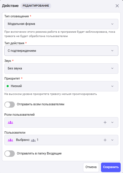 Роли пользователей - поле для выбора ролей пользователей, которым будут отправляться уведомления.