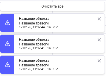 Уведомление - всплывающее уведомление в углу экрана с краткой информацией по тревоге (название объекта, название тревоги, дата и время срабатывания тревоги, время с момента начала действия тревоги). Если очистить список или закрыть тревогу, уведомление придет снова при очередном срабатывании триггера до момента, пока не будет обработана пользователем.
