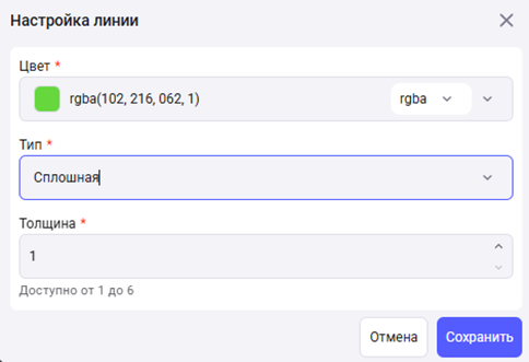 Датчики - смена цвета линии, типа и толщины: нажмите цветной квадрат рядом с датчиком, выберите параметры и нажмите "Сохранить".