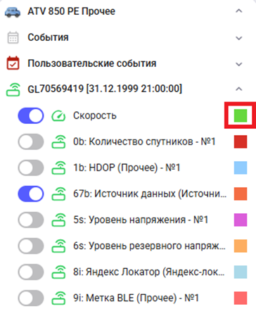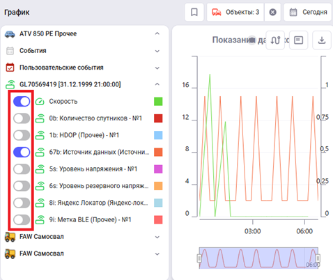 Кликните на тумблер слева от датчика или события для включения их отображения на графике.