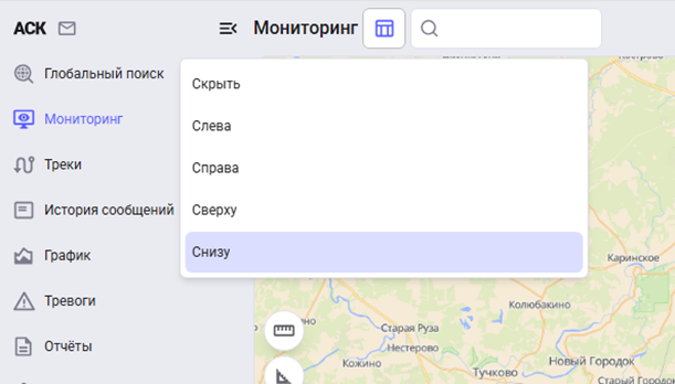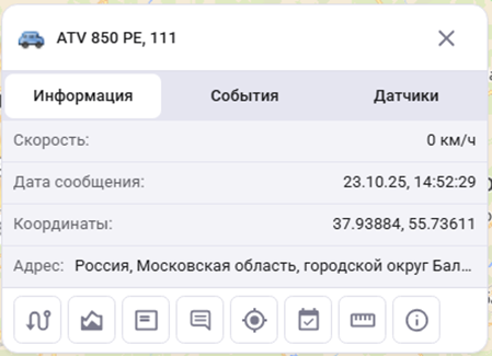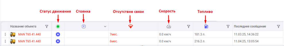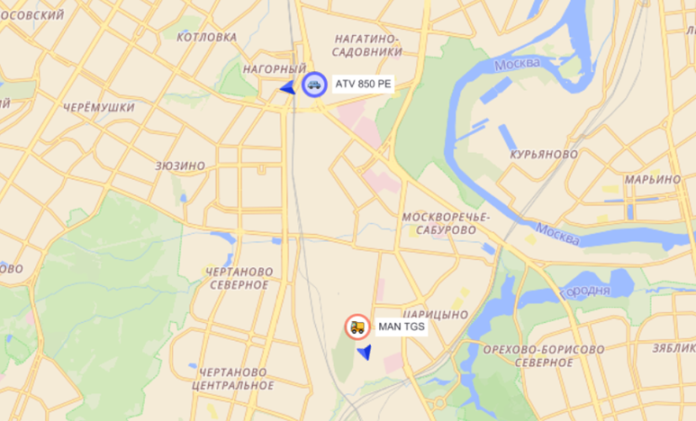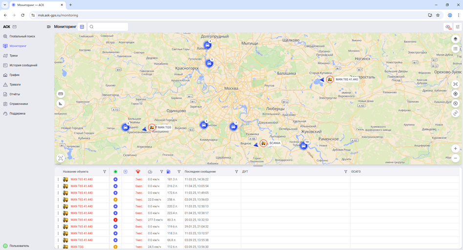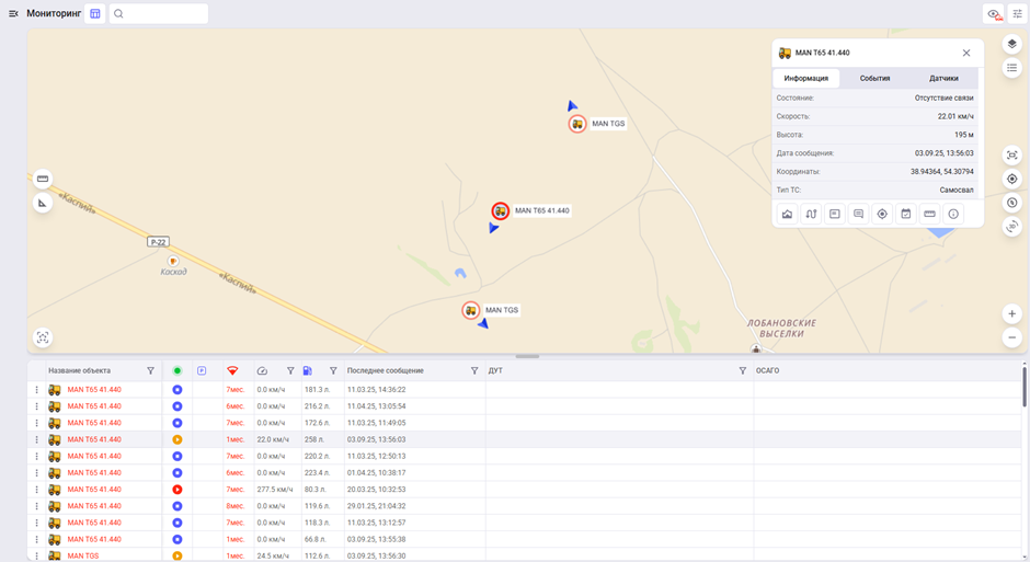 Раздел "Мониторинг" отображает текущие местоположения мобильных объектов (МО) на карте и позволяет просматривать основную оперативную информацию о них - состояние (стоянка/в движении/отсутствие связи), данные датчиков, дату и время последнего сообщения и другие параметры.