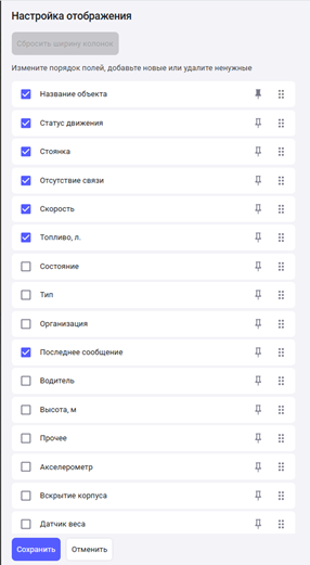 Отображение полей выбирается галочками.