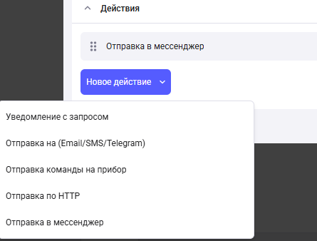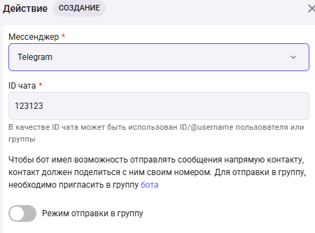 Для отправки сообщения в телеграмм необходимо выбрать «Отправка в мессенджер».