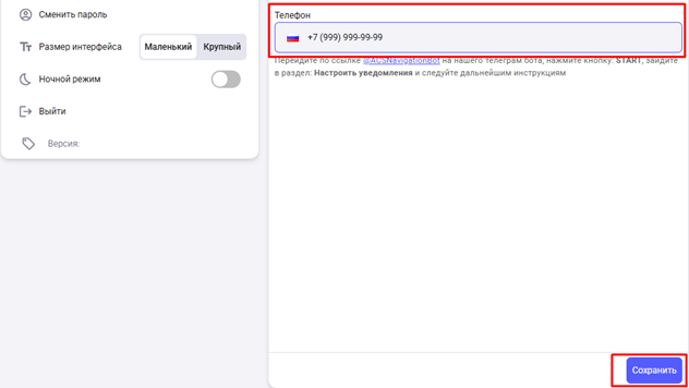 Введите номер телефона и сохраните изменения.