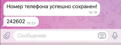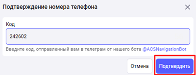 Введите код, полученный в чате Telegram, для подтверждения.