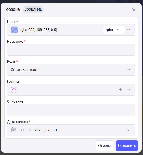В открывшемся окне выберите цвет отображения геозоны на карте, название, роль (по умолчанию “Область на карте”), группу геозон и дату начала действия геозоны.