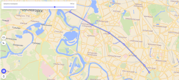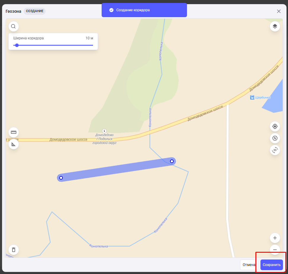 После завершения построения геозоны в верхнем левом углу карты появится ползунок для задания ширины коридора.