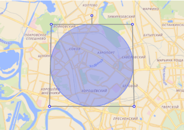 Для изменения размера геозоны необходимо навести курсор на один из углов квадрата, в который вписана геозона, и зажав левую кнопку мыши переместить курсор в положение, при котором геозона примет нужный размер.