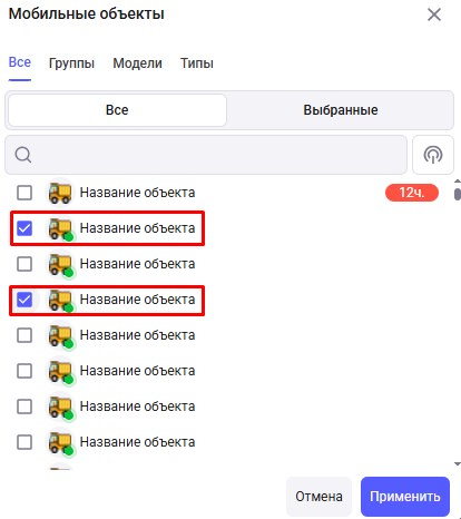 Чтобы выбрать объект или группу объектов, установите галочку слева от нужного элемента.