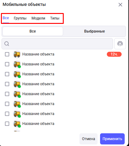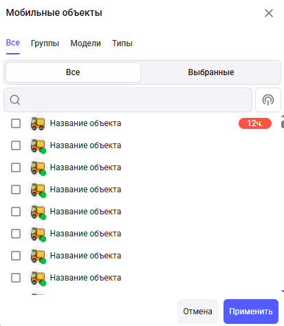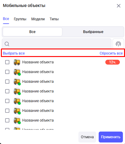 Все - список всех мобильных объектов, доступных пользователю;
