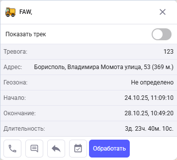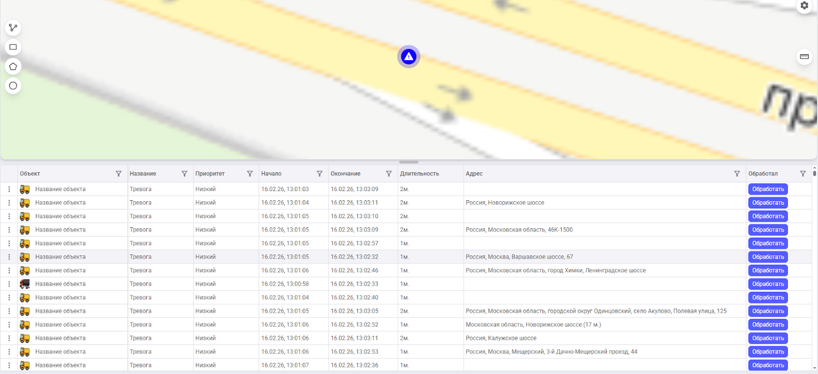 После нажатия на кнопку Обработать тревоги будут доступны для просмотра в Отчёте по тревогам.