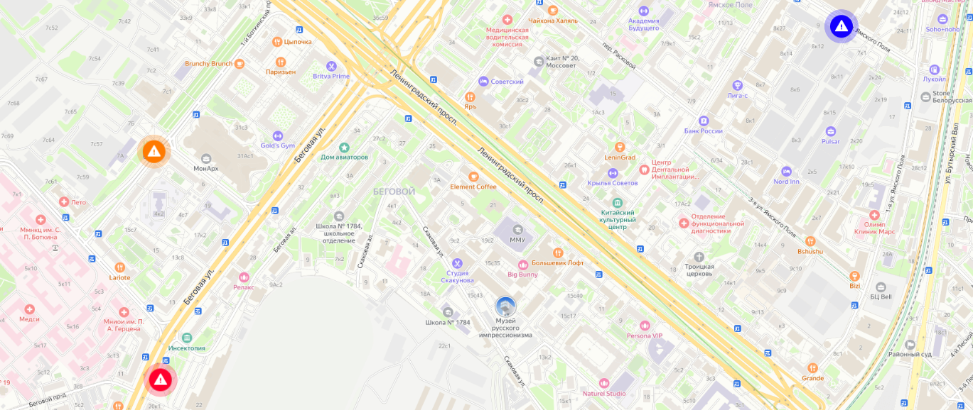Тревоги на карте обозначены треугольниками с восклицательным знаком внутри. Цвет треугольника отражает уровень приоритета тревоги.