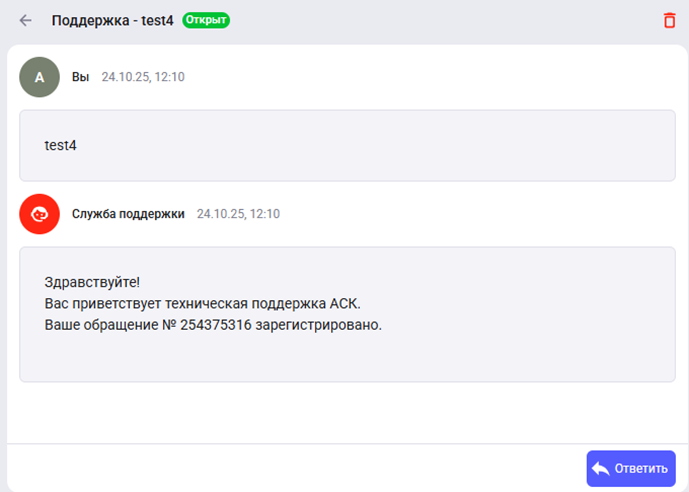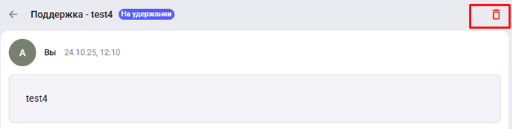 Для удаления обращения используйте кнопку "Удалить" (иконка урны) в правом верхнем углу. Удалённое обращение исчезнет из списка.