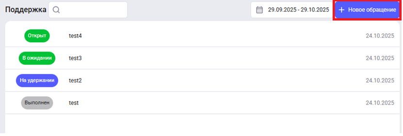 Нажмите кнопку "Новое обращение" в правом верхнем углу окна.