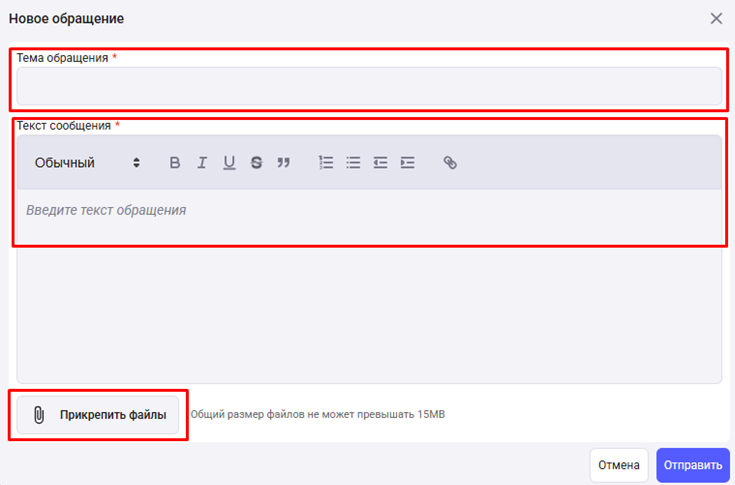 при необходимости прикрепите файлы с помощью кнопки "Прикрепить файлы"