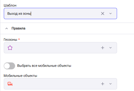 Выход из зоны – тревога сработает, если выбранный МО выйдет из геозоны. Необходимо выбрать геозону и МО.