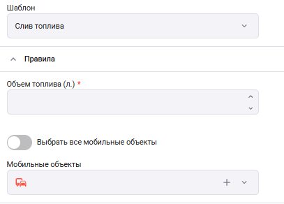 «Событийное правило» используется для создания тревоги по объектам, когда происходит некоторое событие, зарегистрированное в системе (стоянка, заправка, слив и другие).