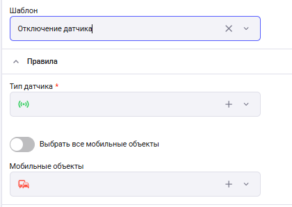 Отключение датчика – тревога сработает, когда с выбранного датчика перестанут поступать показания. Необходимо выбрать датчик и МО.