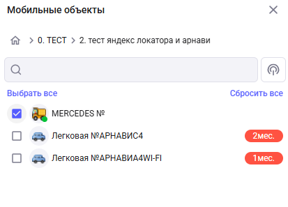 «Выбрать все мобильные объекты» - чекбокс, позволяющий установить фильтр на все доступные мобильные объекты;
