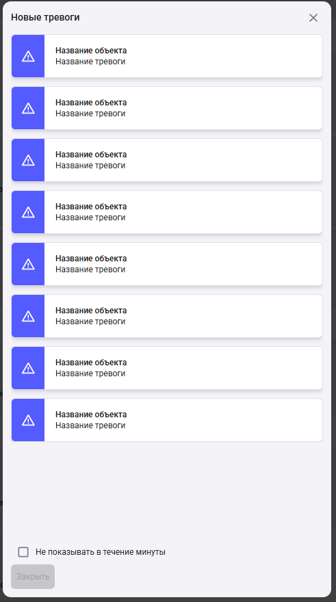Для модальной формы доступна возможность отключения уведомлений о тревоге на минуту с помощью чек-бокса “не показывать в течение минуты”. По истечении минуты окно уведомлений отобразится снова.