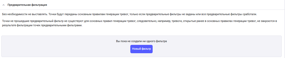 В разделе «Предварительная фильтрация» - можно указать параметры, по которым точки, создающие тревоги, будут фильтроваться ДО проверки условий в разделе «Правила».
