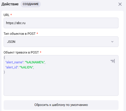 С помощью этого действия можно отправить POST запрос на указанный URL при срабатывании тревоги. Пример: