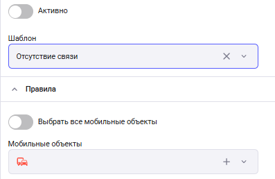 Отсутствие связи – тревога сработает если выбранный МО перейдет в состояние “Отсутствие связи”. Необходимо выбрать МО.