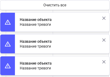 Уведомление - всплывающее уведомление в углу экрана с краткой информацией по тревоге (название объекта, название тревоги, дата и время срабатывания тревоги, время с момента начала действия тревоги). Если очистить список или закрыть тревогу, уведомление придет снова при очередном срабатывании триггера до момента, пока не будет обработана пользователем.