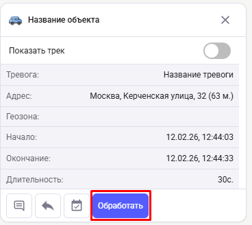 С подтверждением – для обработки таких тревог необходимо нажать кнопку «Обработать» в разделе “Мониторинг”. Переход в раздел “Мониторинг” происходит при клике на уведомление о тревоге. При отсутствии обработки тревоги уведомление будет приходить при продлении тревоги.