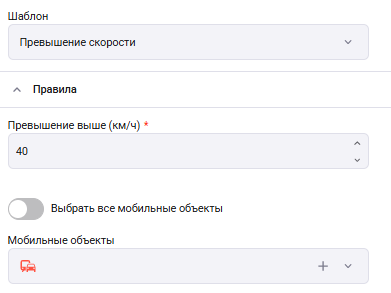 Превышение скорости – тревога сработает при превышении скорости выбранными МО. Необходимо выбрать МО и выставить верхний порог для скорости в км/ч;