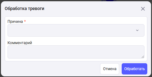 С выставлением причины – для обработки таких действий необходимо выставить причину тревоги. Причины тревог для выбора в окне обработки тревоги необходимо указать в разделе “Причины” при создании тревоги. При отсутствии обработки тревоги уведомление будет приходить при продлении тревоги.